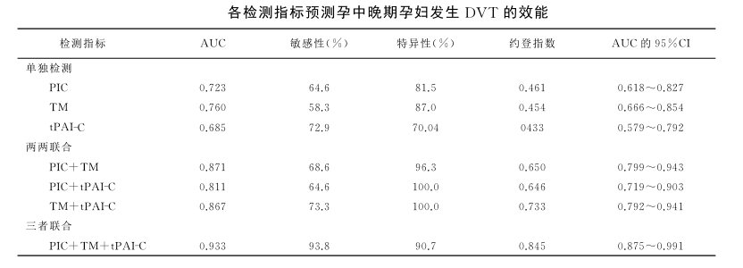 為了降低產(chǎn)前和產(chǎn)后出血的風(fēng)險(xiǎn),并在妊娠和分娩期間維持胎盤功能,生理高凝狀態(tài)伴隨著整個(gè)妊娠時(shí)間,然而過(guò)度的高凝狀態(tài)極易并發(fā)妊娠期VTE。沈劼等研究表明Caprini評(píng)分與靜脈血漿TM、TAT、t-PAIC、PIC水平對(duì)剖宮產(chǎn)術(shù)后DVT形成風(fēng)險(xiǎn)有較好的預(yù)測(cè)價(jià)值,提示臨床可根據(jù)新血栓四項(xiàng)水平早期采取措施預(yù)防術(shù)后DVT的發(fā)生。王宇等研究表明TM、TAT、t-PAIC、PIC為影響孕中晚DVT發(fā)生的獨(dú)立預(yù)測(cè)因子,新血栓四項(xiàng)聯(lián)合檢測(cè)對(duì)孕中晚期孕婦發(fā)生DVT的預(yù)測(cè)價(jià)值明顯優(yōu)于各單項(xiàng)指標(biāo)檢測(cè)或兩兩聯(lián)合(P<0.05),提示聯(lián)合檢測(cè)可為臨床早期診治提供參考,見(jiàn)下表。