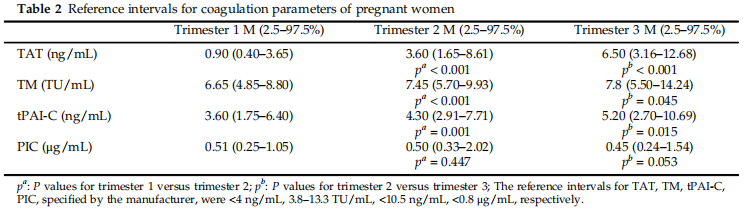 目前絕大多數(shù)實(shí)驗(yàn)室給出的凝血指標(biāo)參考范圍都是非孕期和普通人群,而妊娠期孕婦的血液是處于生理性的高凝狀態(tài),故孕婦不能參照非妊娠人群凝血指標(biāo)的參考區(qū)間,在將血栓四項(xiàng)指標(biāo)普遍用于妊娠期間與血栓性疾病的臨床評(píng)估之前,有必要為健康孕產(chǎn)婦建立參考區(qū)間。北京大學(xué)第三醫(yī)院張文靜等老師在《THE JOURNAL OF Obstetrics ancGynaecology Research》發(fā)表的學(xué)術(shù)論文對(duì)中國(guó)孕婦妊娠期TAT、TM、t-PAIC、PIC的變化及健康孕產(chǎn)婦妊娠期特定參考范圍進(jìn)行了研究。研究納入華北地區(qū)190例健康孕產(chǎn)婦,采用化學(xué)發(fā)光法檢測(cè)TAT、TM、t-PAIC和PIC水平,在2.5%和97.5%的分布范圍建立了妊娠期特定參考區(qū)間(結(jié)果見(jiàn)表2)。最終研究表明,TAT、TM、t-PAIC的水平從孕早期(妊娠5-12周)到孕晚期(妊娠28-40周)顯著增加,而PIC的水平并沒(méi)有隨著孕周的增加而發(fā)生顯著變化。